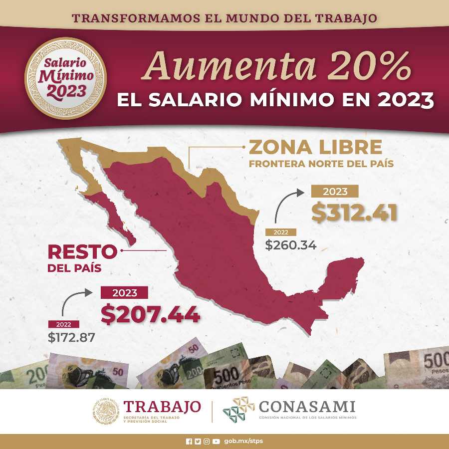 El salario mínimo de las y los trabajadores en el país aumentará a 207.44 pesos; mientras que en la zona libre de la frontera norte será de 312.4