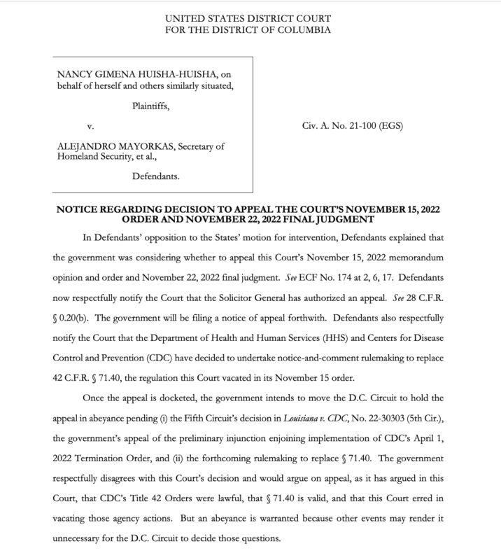 La administración de presidente Joe Biden anunció que apelará el fallo del juez Emmet Sullivan, que ordenaba el fin del Título 42.