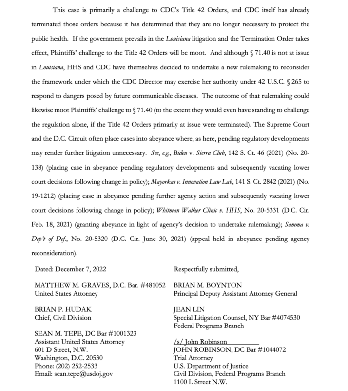 El objetivo del gobierno, es espera al fallo de la Corte de Apelaciones del Quinto Circuito para establecer que los CDC tenían la autoridad legal para determinar necesario la implementación de esta medida.