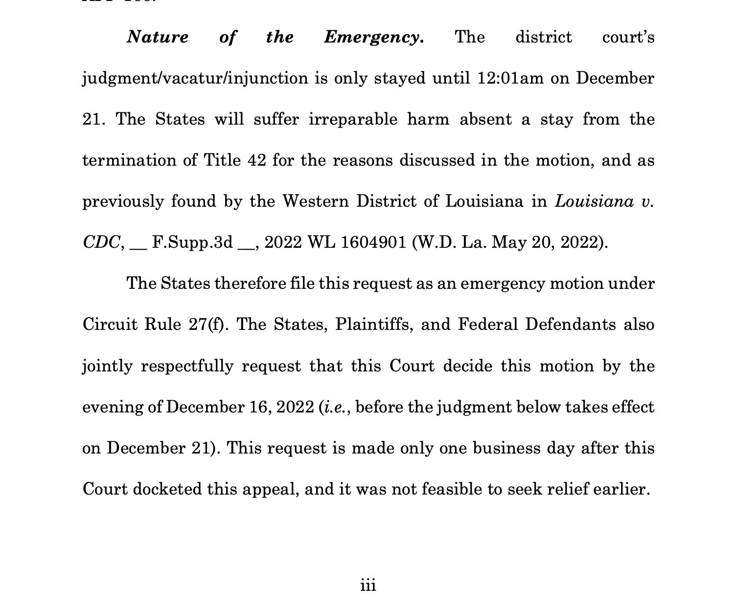 Aunque su apelación no sería para detener esta política, sería para que la Corte de Apelaciones del Quinto Circuito resuelva un litigio pendiente en el que podría determinar si los CDC tenían la autoridad legal para determinar necesario la implementación de esta medida.