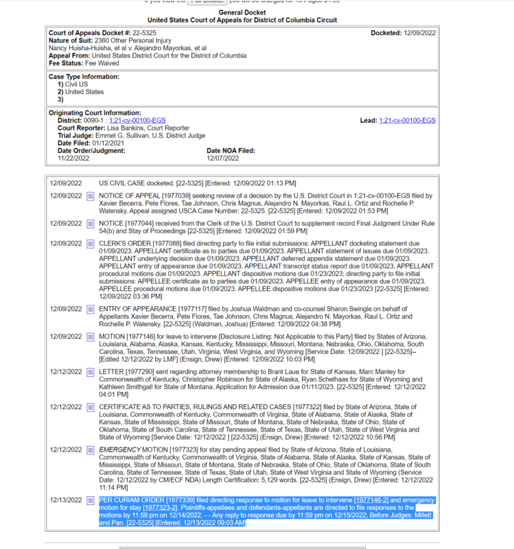 Por lo pronto, la Corte de Apelaciones del Cuarto Circuito emitió este martes un cronograma de informes para mañana, se espera que de una respuesta a los estados para el jueves.