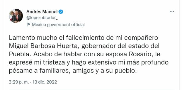 A través de sus redes sociales, López Obrador lamentó el fallecimiento de su compañero, al mismo tiempo emitió su pésame por la pérdida.