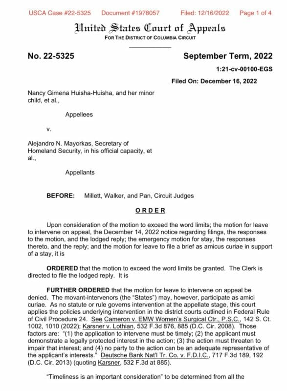 La solicitud presentada por 19 estados republicanos a la Corte de Apelaciones de Cuarto Distrito para impedir que el Título 42 termine fue rechazada.