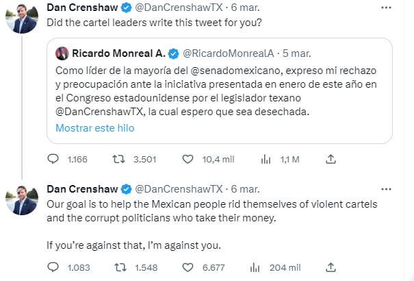 El representante republicano, Dan Crewshaw, acusó al político mexicano Ricardo Monreal de “twittear por el narco” luego de rechazar una política propuesta por Estados Unidos.
