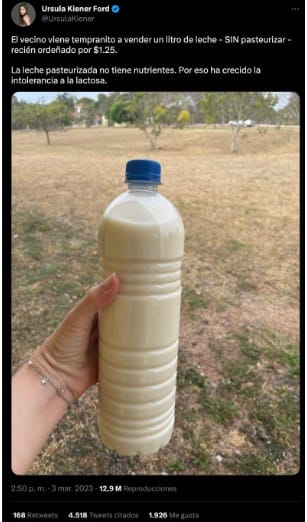 “El vecino viene tempranito a vender un litro de leche – SIN pasteurizar – recién ordeñado por $1.25. La leche pasteurizada no tiene nutrientes. Por eso ha crecido la intolerancia a la lactosa”.
