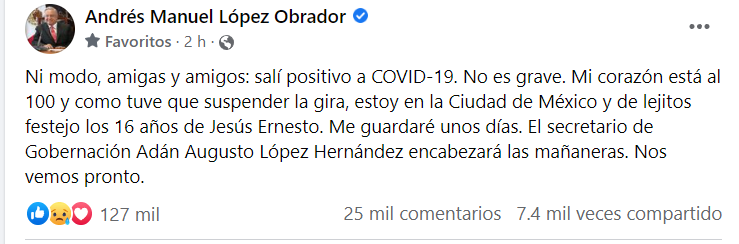 “Ni modo, amigas y amigos: salí positivo a COVID-19. No es grave. Mi corazón está al 100 y como tuve que suspender la gira, estoy en la Ciudad de México y de lejitos festejo los 16 años de Jesús Ernesto. Me guardaré unos días. Adán Augusto López encabezará las mañaneras. Nos vemos pronto”, ese fue el mensaje que publicó en sus redes sociales.
