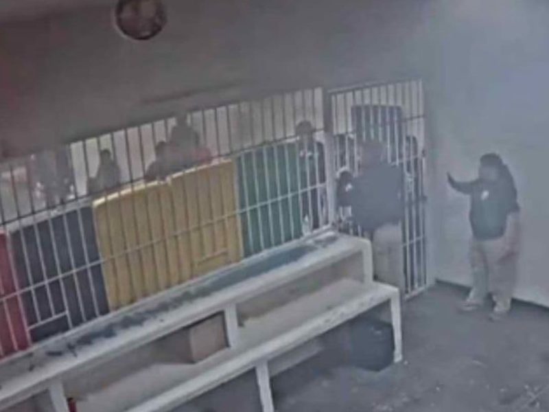 Cada vez hay más humo en la estación y tanto el guardia, quien presuntamente tiene las llaves de la celda, como el agente de migración, salen del lugar tranquilamente dejando a los migrantes encerrados.