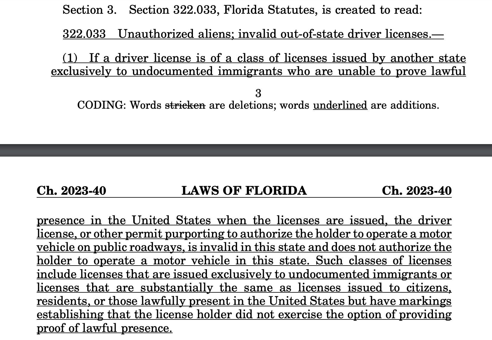 “Si una licencia de conducir es de una categoría de licencias emitidas por otro estado exclusivamente para inmigrantes indocumentados que no puedan demostrar presencia legal en los Estados Unidos. cuando la licencia fue emitida, esa licencia, o cualquier otro permiso que busque autorizar al conductor a manejar un vehículo de motor en vías públicas, no es válida en este estado y no autoriza a que el poseedor de la licencia pueda manejar un vehículo de motor en este estado”.