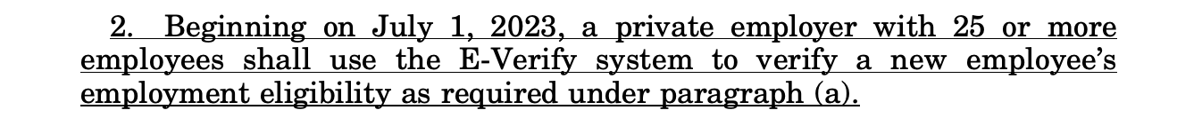 “A partir del 1 de julio de 2023, cualquier empleador privado con 25 o más empleados debe usar el sistema E-Verify”.