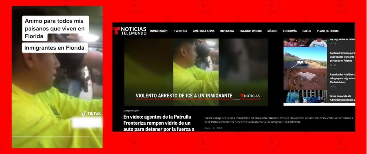 “Ánimo para todos mis paisanos que viven en Florida. Inmigrantes de Florida” es el texto de un video viral de TikTok con más de 1 millón de vistas que se posteó el 19 de mayo de 2023, y que muestra a un hispano siendo arrestado por agentes de la Patrulla Fronteriza (CBP). Esto es falso. El video del arresto no fue grabado en Florida, sino en San Bernardino, California, en 2020.