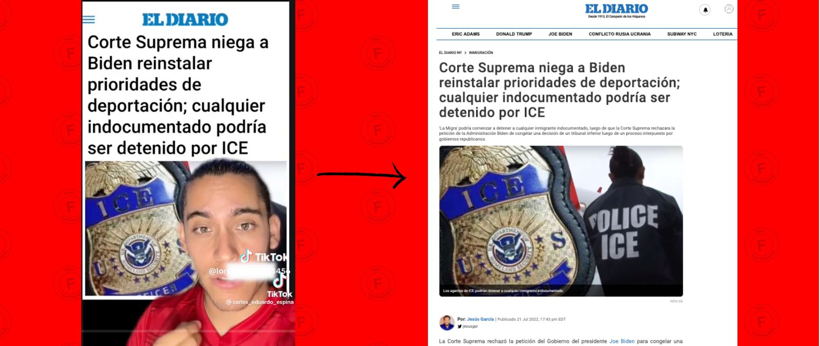 El audio de TikTok al que hacemos referencia en esta nota dice lo siguiente: “Lamentablemente mi gente, ya es oficial. A partir de ahora todos los inmigrantes indocumentados en Estados Unidos son prioridad para ser arrestados y deportados. No importa si tienen un récord criminal o no, o cuánto tiempo lleven en Estados Unidos”.