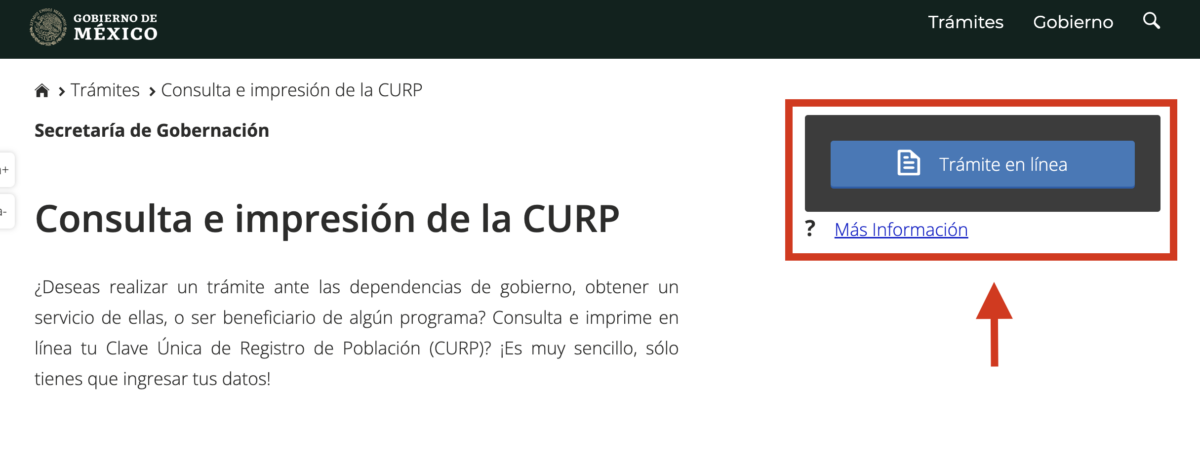 El siguiente paso es entrar al apartado que dice “Consulta e impresión de la CURP” y darle click a donde dice “Trámite en línea”