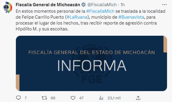 Fue alrededor de la una de la tarde cuando la Fiscalía de Michoacán informó que se trasladaban a la localidad de Felipe Carrillo Puerto, municipio de Buenavista, por un reporte sobre una agresión contra Hipólito M. y sus escoltas.