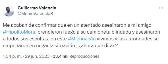 No obstante, minutos antes, el presidente del Comité Directivo Estatal del PRI en Michoacán, Guillermo Valencia anunció el asesinato de Hipólito Mora.