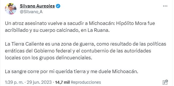 En tanto, el exgobernador de Michoacán culpó al gobierno federal por el homicidio del ex autodefensa. A través de su cuenta de Twitter dijo que “la Tierra Caliente es una zona de guerra, como resultado de las políticas erráticas del Gobierno Federal y el contubernio de las autoridades locales con los grupos delincuenciales”.