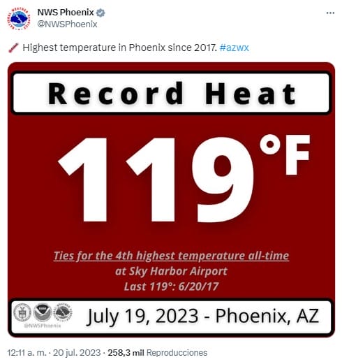 Por otro lado, Phoenix alcanzó el 19 de julio de 2023 los 119 grados Fahrenheit -48.3 grados Celsius-. Se trata de la temperatura más alta detectada en la ciudad y no se registraba desde 2017, según el Servicio Nacional de Meteorología.