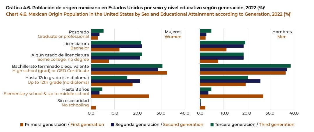 Si bien la educación a nivel bachillerato es similar para mujeres y hombres, tanto en primera, segunda y tercera generación, hay más mexicanas con licenciatura.