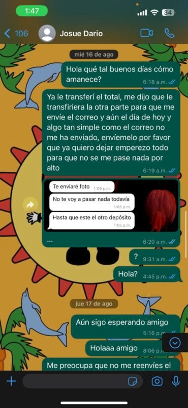 No obstante, antes de enviarle el correo con la información de esta le cobró el resto del dinero y fue ahí cuando dejó de responder.