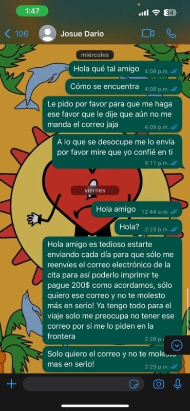 El trato era sencillo, Carlos pagó la mitad del dinero para obtener una cita; aunque él ya tenía una cuenta de CBP One, el defraudador le dijo que “le iba a hacer una cuenta nueva” para poder obtener la cita con mayor rapidez.