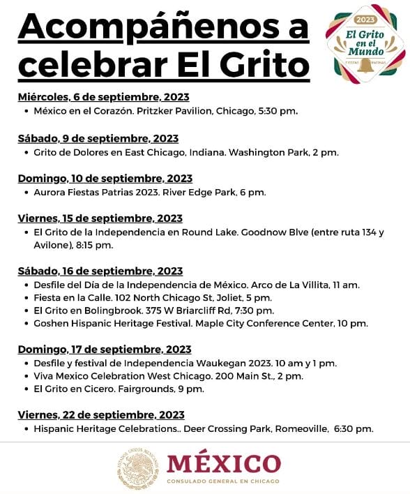 - Grito de independencia en Round Lake (viernes 15 de septiembre a las 8:15 de la noche)