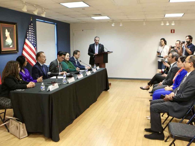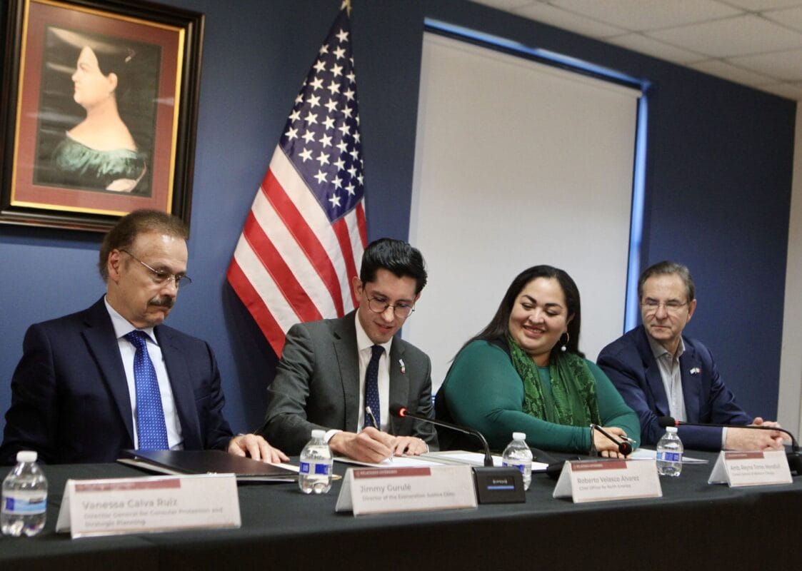 La firma del programa “Defensoría a Personas Mexicanas en Materia Penal en Estados Unidos” contó con la presencia de el jefe de Unidad para América del Norte, Roberto Velasco Álvarez; la directora general de Protección Consular y Planeación Estratégica de la Secretaría de Relaciones Exteriores, Vanessa Calva Ruiz; y la cónsul General de México en Chicago, Reyna Torres Mendivil.