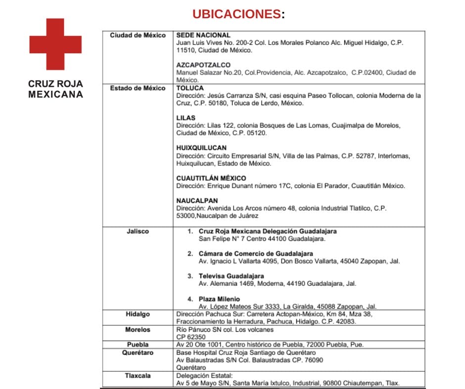 Si estas en México, te compartimos las listas con las ubicaciones de las sedes que la Cruz Roja instaló, para que puedas dejar tus donativos en especie, recuerda que solo se recibirán los productos siguientes: aceite, arroz, frijol, lentejas, azúcar, sal. En sobres: sopas de pasta, cubos de consomé, harina para atole, chocolate en polvo. Enlatados y frascos: atún, sardina, café soluble, mermelada, mayonesa y lata de chiles.
