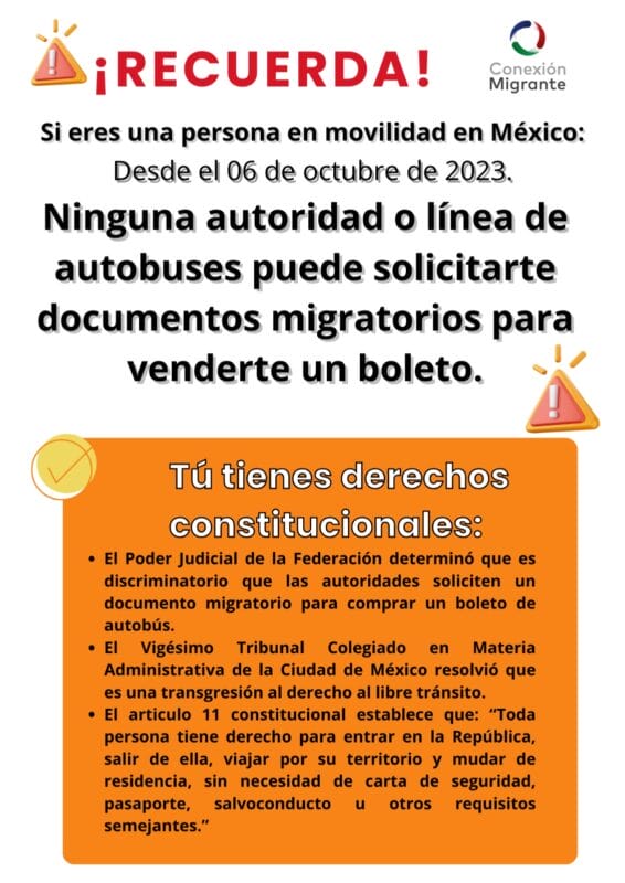 “El Vigésimo Tribunal Colegiado en Materia Administrativa de la Ciudad de México reconoció que solicitar un permiso migratorio para comprar un boleto de autobús y subir a uno, para viajar dentro del país, es una transgresión al derecho al libre tránsito y constituye un acto discriminatorio contra las personas migrantes”