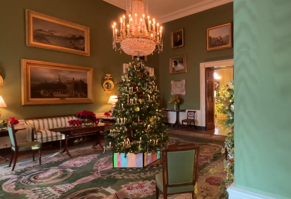 En el ala Este de la Casa Blanca se aprecian ramas festivas que significan “abrazar el niño interior”. Al interior de la casa, el primer árbol de navidad está en la sala con estrellas doradas en honor a los militares acaecidos.