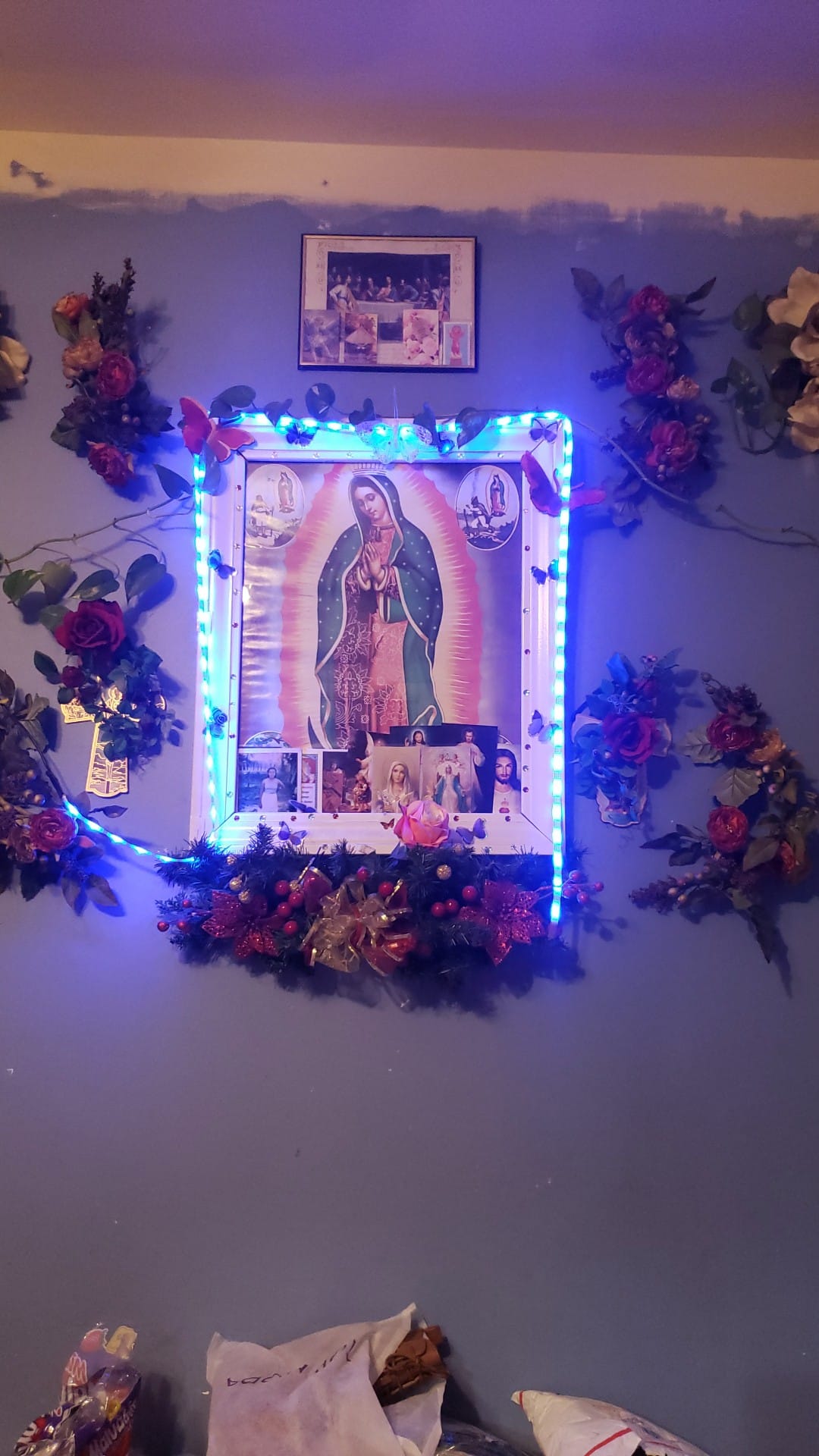 Más flores y estampitas de Dios adornan los altares para la virgen de Guadalupe.
