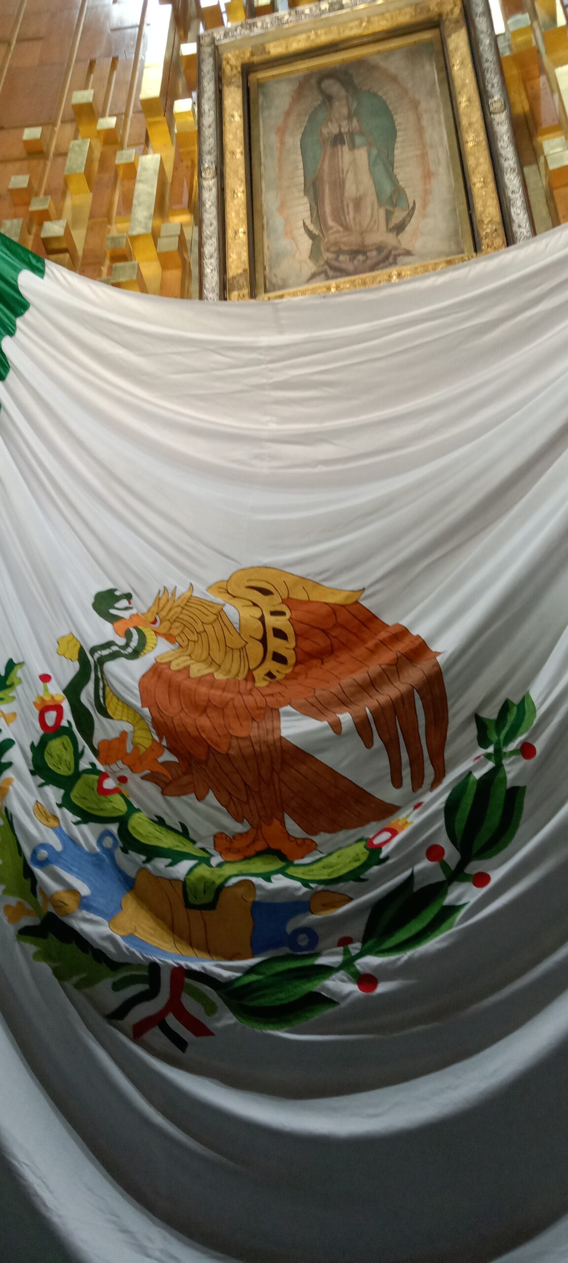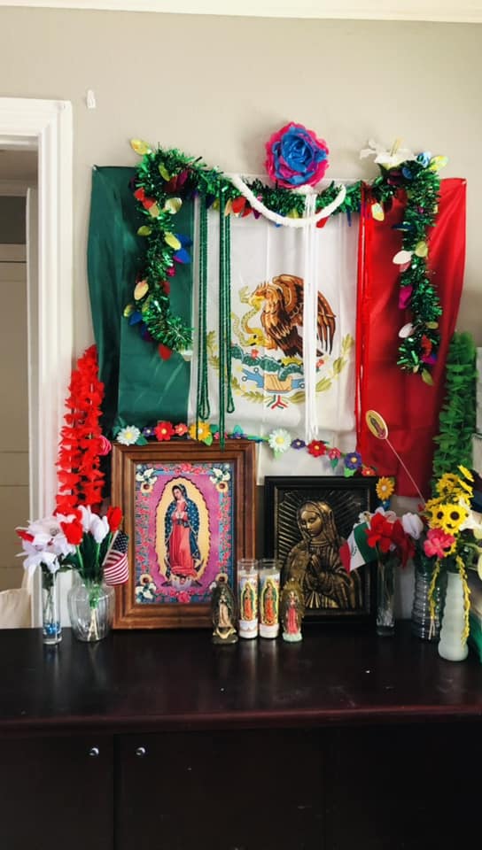 Imelda nos compartió como honra a la virgen en su hogar, muy orgullosa de sus raíces mexicanas colocó la banera de la nación y otros elementos que dieron como resultado un altar muy colorido.