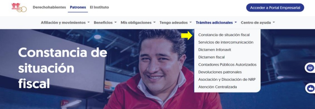 - Ingresa al portal del Infonavit: Accede a la sección de Patrones y selecciona “Constancia de Situación Fiscal”.