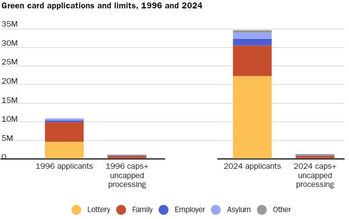 Para mayor contexto, al comienzo de este año fiscal, en octubre de 2023, había unas 34.7 millones de solicitudes de Green Card pendientes. En comparación, en el mismo periodo de 1996 había aproximadamente 10 millones de casos pendientes.
