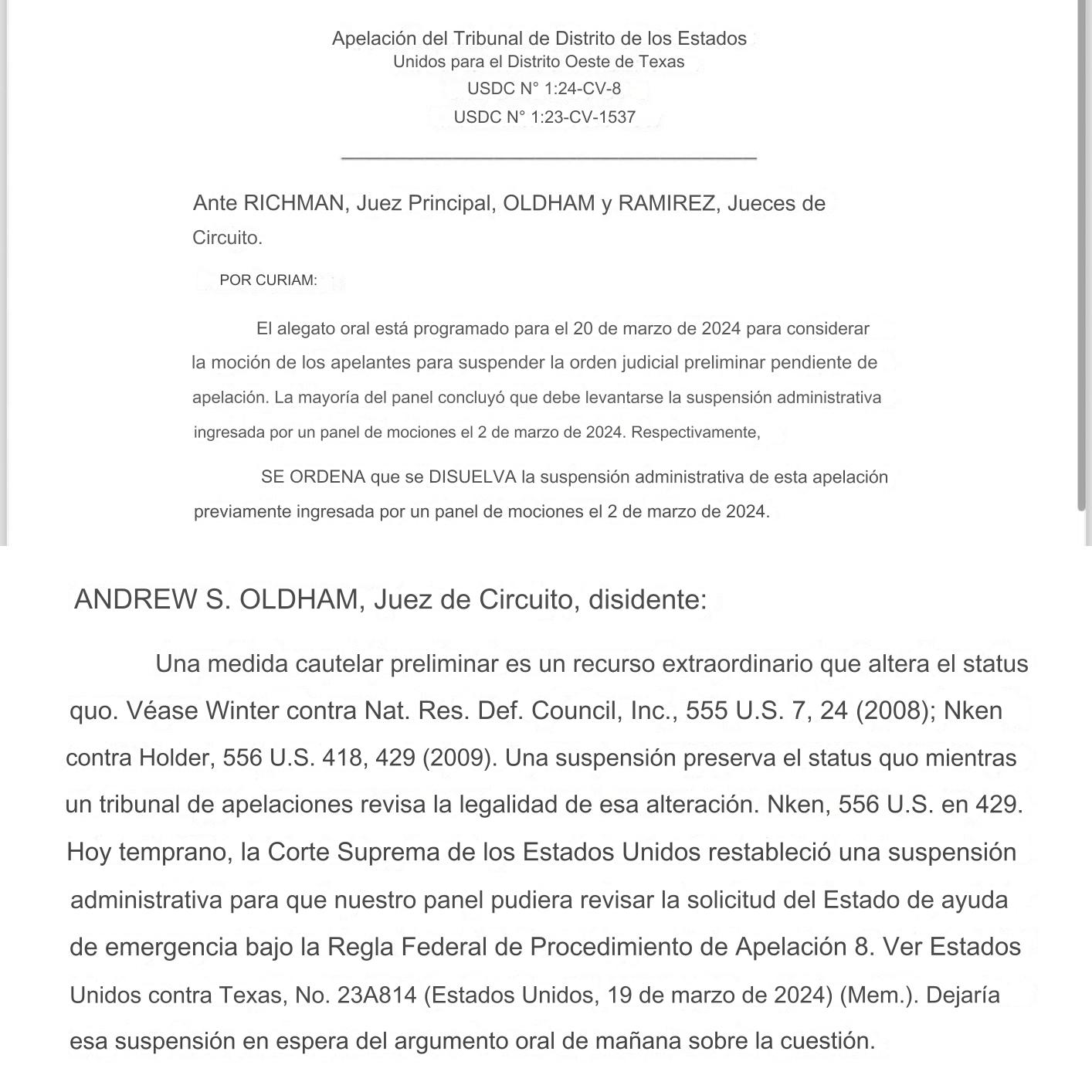 “#BREAKING : #SB4 se vuelve a bloquear. La mayoría de los argumentos de la audiencia del panel del Quinto Circuito sobre la solicitud de suspensión de Texas *mañana por la mañana* acaba de emitir una orden que “disuelve” la “suspensión administrativa” que un panel diferente impuso el 2 de marzo. Por lo tanto, la orden judicial vuelve a entrar en vigor.”