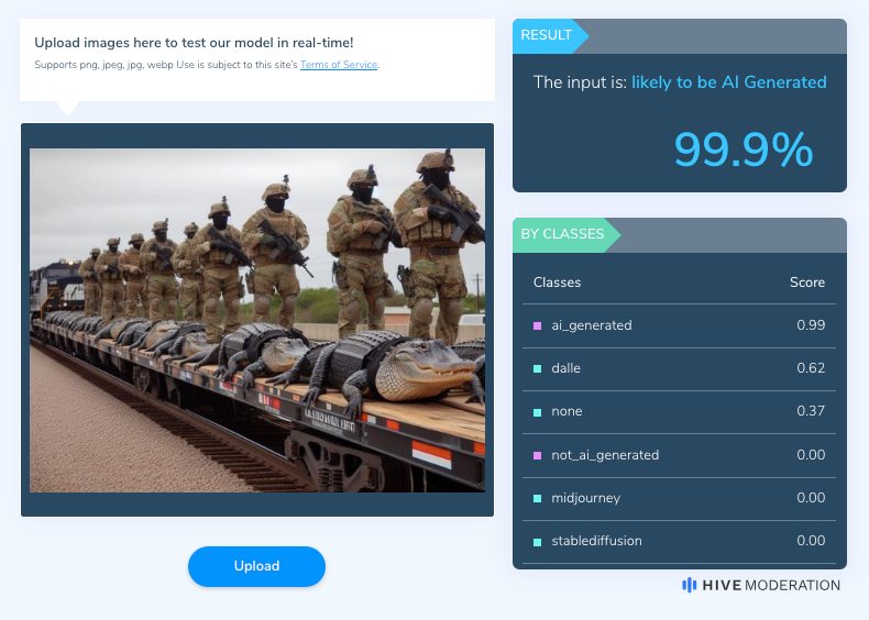- Para confirmar, utilizamos Hive Moderation, una herramienta de detección de imágenes creadas con IA. El resultado: 99.9% de probabilidad de que la imagen haya sido creada con IA y 62% de probabilidad de que haya sido generada con el software Dall-e, que pertenece a OpenAI (la misma compañía que creó ChatGPT).