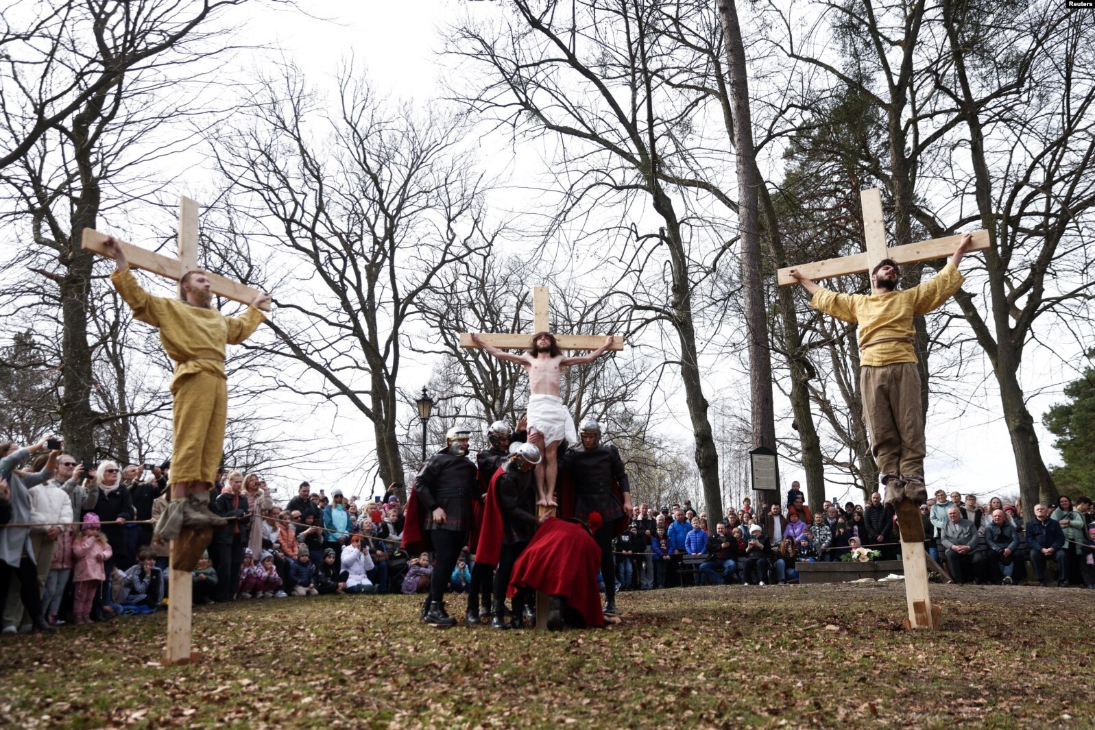Más devotos católicos polacos recrean el viacrucis en este Viernes Santo 2024, estas imágenes corresponden a las celebraciones de la Semana Santa en Kalwaria Wejherowska en Wejherowo, Polonia.