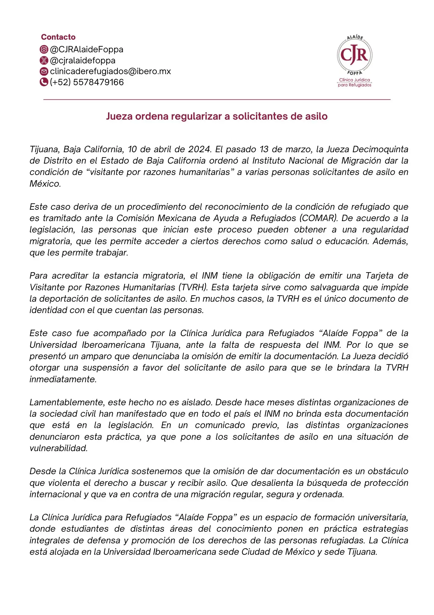 A través de un comunicado, la Clínica Jurídica para Refugiados “Alaíde Foppa” (CJR) detalló que este fallo fue gracias a un recurso legal que interpusieron el pasado 13 de marzo.