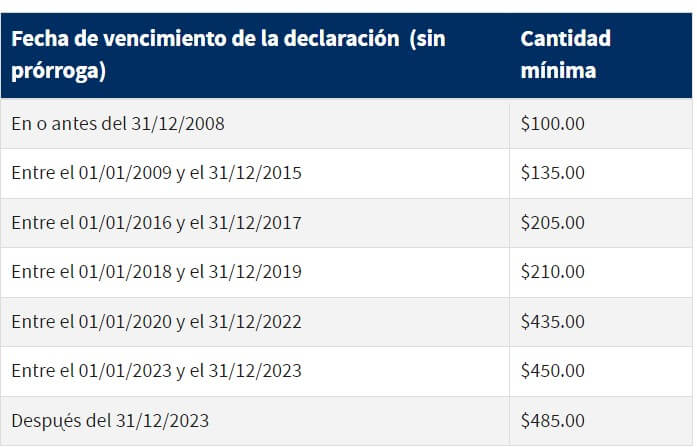 Si la declaración tiene más de 60 días de retraso, la multa mínima por incumplimiento de presentar la declaración de impuestos es la cantidad que se muestra a continuación: