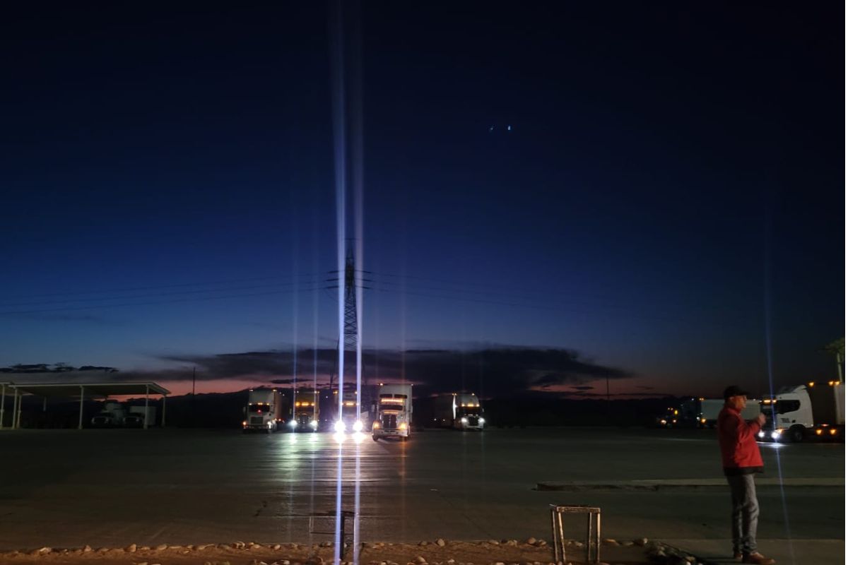 Inspección militar antes del amanecer en Querobabi, Sonora. Ahí es posible ver además de autobuses, una larga fila de camiones de carga (trailers) que también son inspeccionados. | Foto: Janette de los Reyes