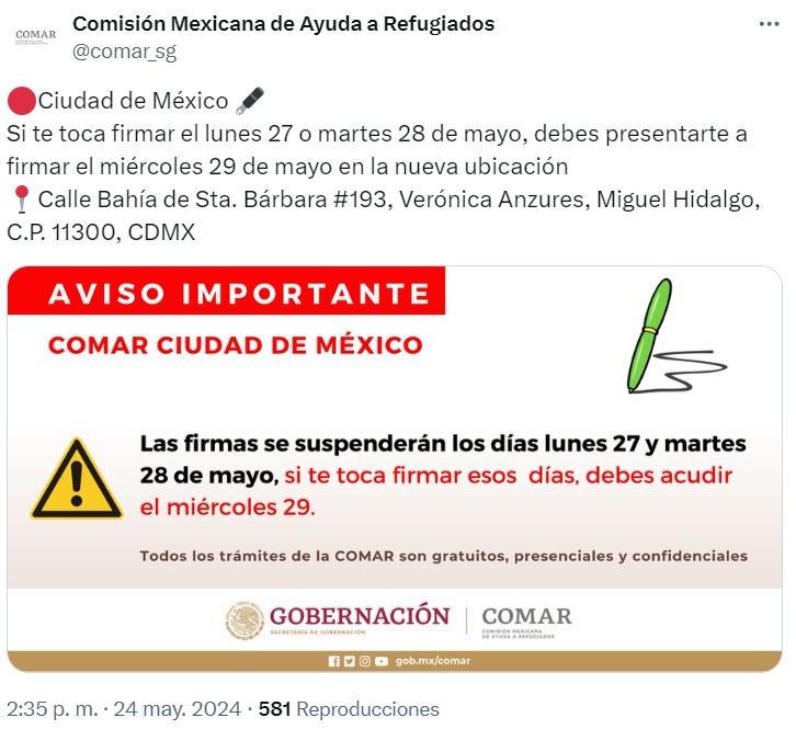 La semana pasada, la Comar informó que los solicitantes de refugio debían acudir a hacer sus trámites a la nueva sede ubicada en la alcaldía Miguel Hidalgo en la Ciudad de México, sin embargo, interrumpieron sus servicios y desde ayer no tienen un espacio para recibir a los migrantes.