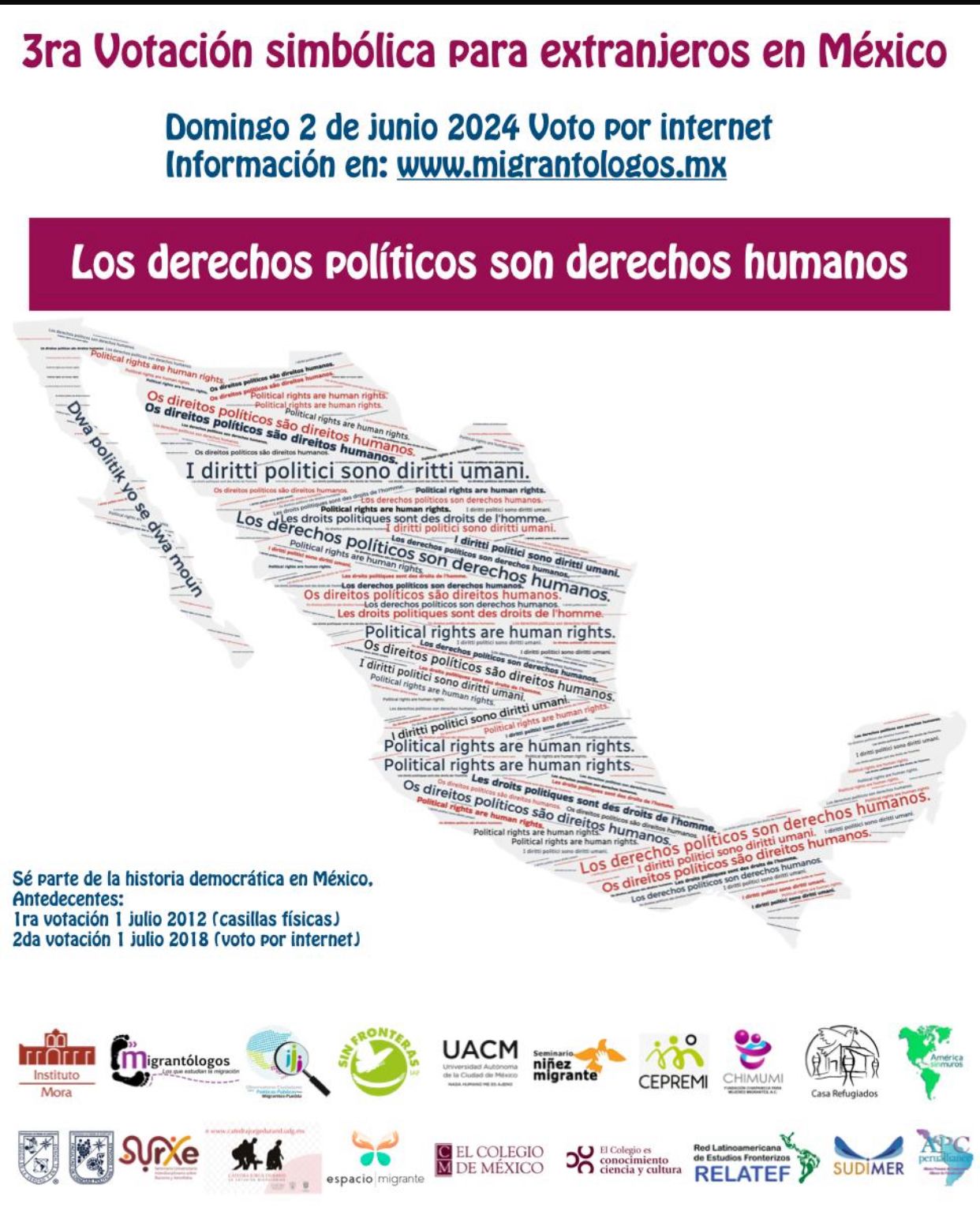 Por tercera ocasión, México llevará a cabo estas elecciones simbólicas luego de que se celebraran en 2012 y 2018. La noticia fue anunciada por Leticia Calderón Chelius, presidenta de Sin Fronteras IAP, quienes organizan esta iniciativa junto con Migrantólogos, Espacio Migrante, Red Latinoamericana de Estudios Fronterizos (RELATEF), Casa Refugiados y más.