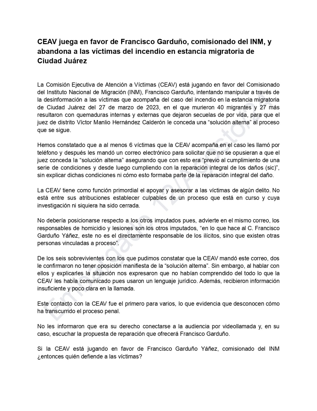 Las organizaciones civiles recordaron que el INM ha intentado manipular a las víctimas del incendio en Ciudad Juárez a través de a través de la desinformación, todo esto para que el juez de distrito Víctor Manlio Hernández Calderón le conceda una “solución alterna” al proceso que se sigue.