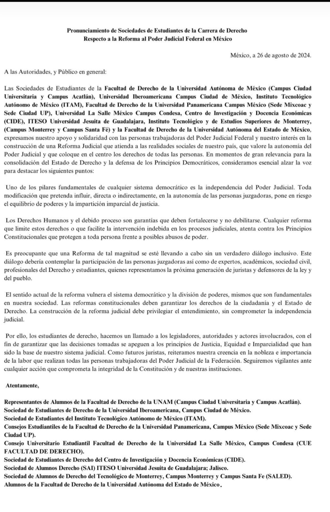 Diversas sociedades de estudiantes de Derecho de México se oponen a la Reforma Judicial a través de un comunicado oficial. Los estudiantes de universidades mexicanas han expresado su preocupación por la reforma al Poder Judicial Federal señalando la importancia de garantizar la independencia del Poder Judicial, cuya cualidad es fundamental para mantener el equilibrio de poderes y la justicia imparcial.
