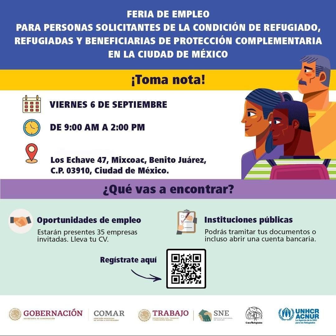 El próximo viernes 6 de septiembre, de 9:00 AM a 2:00 PM, se llevará a cabo una feria de empleo en la Ciudad de México, dirigida específicamente a personas solicitantes de la condición de refugiado, refugiadas, y beneficiarias de protección complementaria. El evento tendrá lugar en Los Echave 47, Mixcoac, Benito Juárez, C.P. 03910, Ciudad de México.