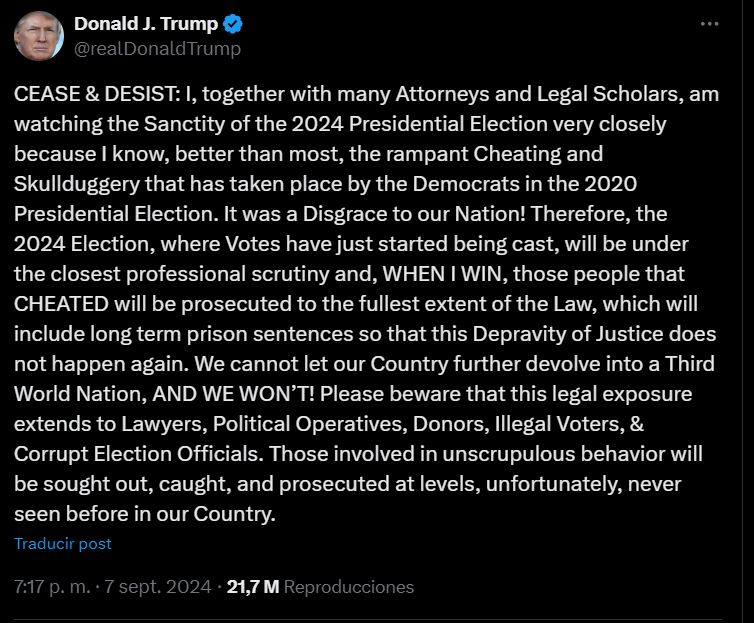 A través de sus redes sociales, el magnate publicó un mensaje de “cese y desista” donde dijo que él, junto a muchos abogados y académicos legales, están observando de cerca “la santidad de las elecciones 2024”.