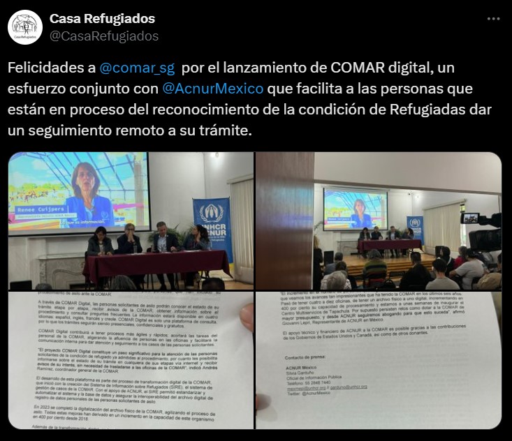 Por otro lado, el Acnur destacó el trabajo de la Comisión para atender las peticiones de refugio en México, parte de estas mejoras se darán con las nuevas oficinas de la Comar en Tapachula, las cuales serán un Centro Multiservicios que iniciará operaciones en 2025.