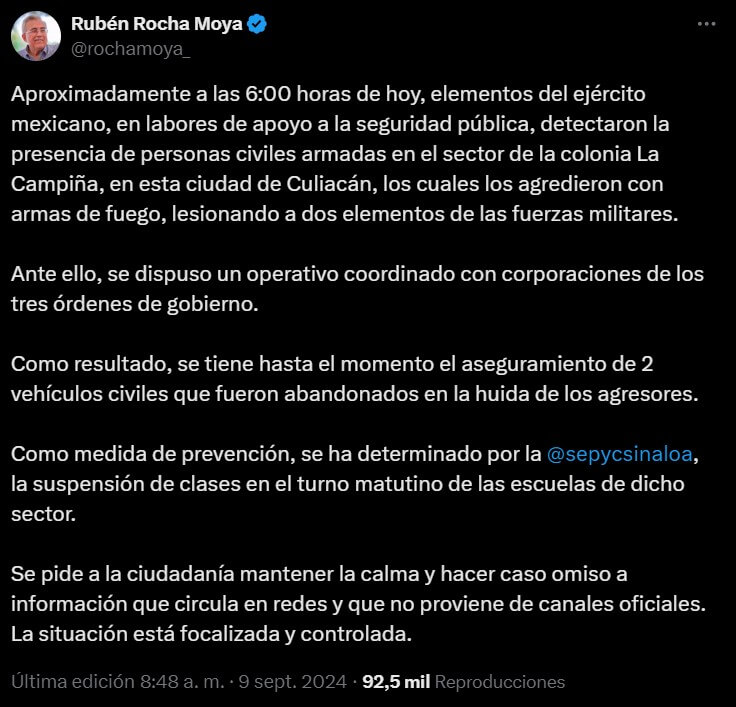 A través de sus redes sociales, Rocha Moya detalló que los hechos iniciaron aproximadamente a las 6 de la mañana, hora en la que los elementos del Ejército detectaron la presencia de civiles armados en la colonia La Campiña, en Culiacán.