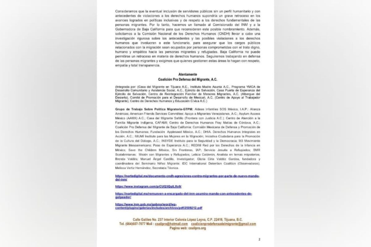 “La posible asignación de un funcionario con tales antecedentes, es motivo de alarma para las organizaciones defensoras de derechos humanos de personas migrantes y refugiadas de diversas nacionalidades”, cita el comunicado.