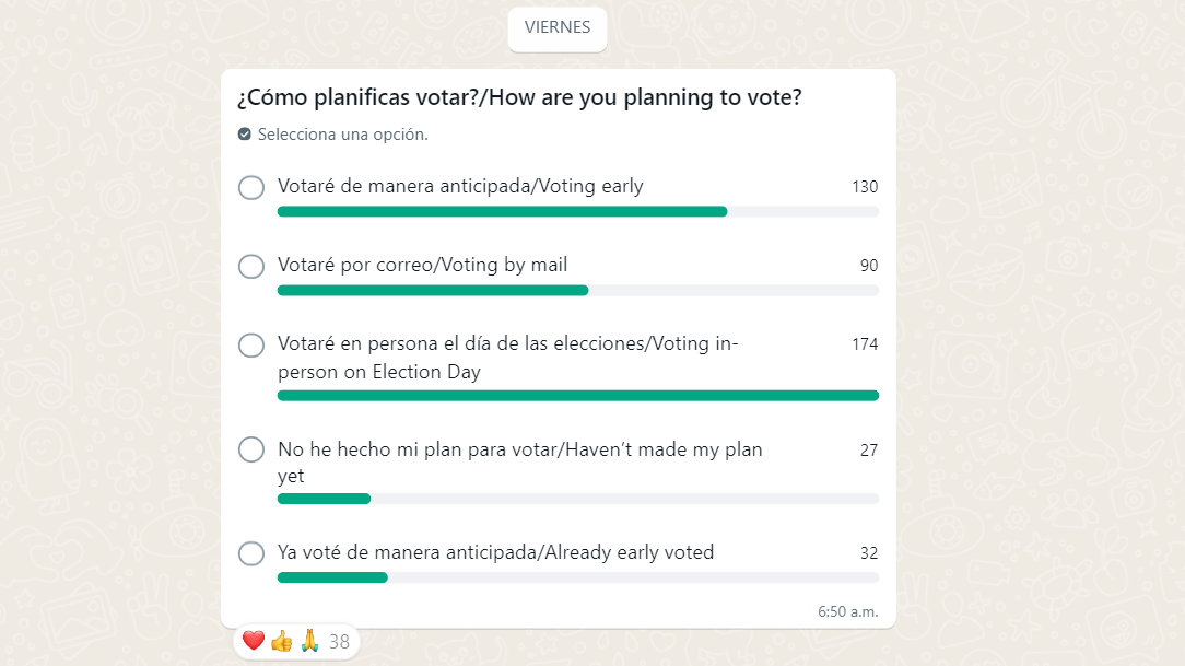 En un esfuerzo por entender cómo los latinos planean ejercer su voto, el canal de Kamala Harris en WhatsApp realizó una encuesta que revela la participación de esta comunidad.