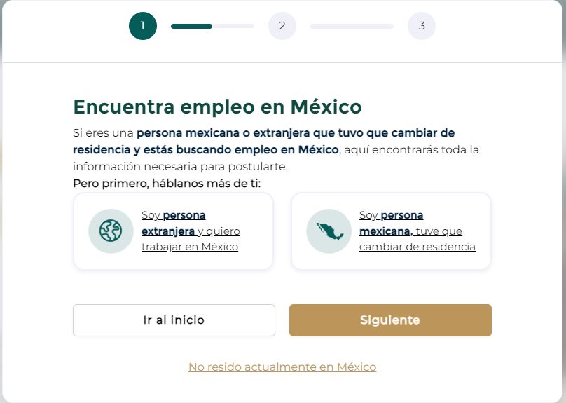 Nada más ingresar a su portal (da clic aquí), México te Emplea te pregunta si eres extranjero o mexicano que tuvo que cambiar de residencia. Si eliges extranjero deberás proporcionar tu CURP, si no tienes una no deberás preocuparte, pues aún así podrás acceder a la sección de búsqueda de empleos.