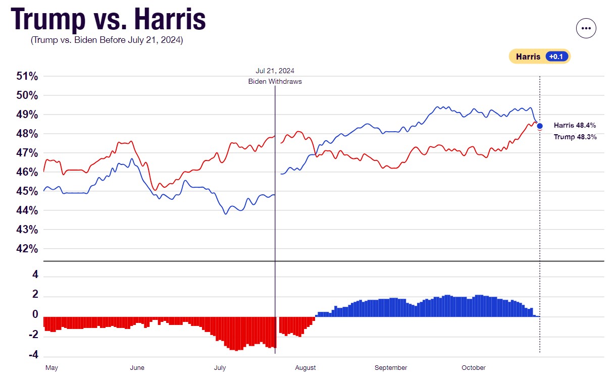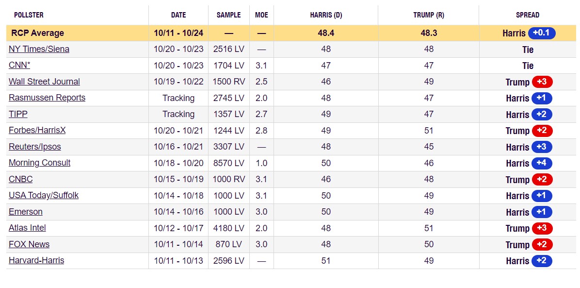 De acuerdo con el sitio web de noticias políticas y de datos de encuestas estadounidenses, las últimas encuestas y sondeos realizados por los distintos medios muestran como Donald Trump está a pocos puntos porcentuales de alcanzar a Kamala Harris, incluso en las encuestas de CNN y Wall Street Journal están empatados.